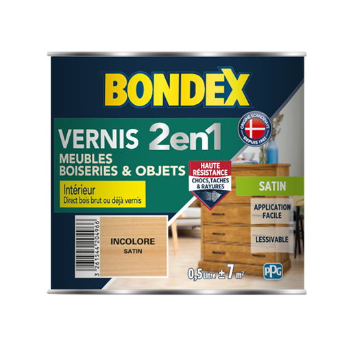 D'aspect satiné ou brillant, le vernis 2en1 Bondex convient à tout type de meubles et boiseries. Il protège efficacement le bois et le rend imperméable à l’eau, aux taches et à l’usure avec une finition parfaitement lisse et tendue.